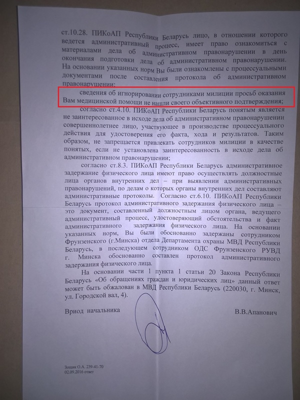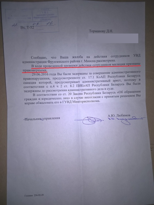 Параллельно с этим я отправил жалобу на действия сотрудников Фрунзенского РУВД. Сейчас дословно не воспроизведу, но помню, что в ней было шесть пунктов (вопросы а-ля “по какой причине задержали”, “почему не отпустили домой до суда”; указал на явные нестыковки в материалах дела). Через какое-то время пришел ответ, где на шесть пунктов мне ответили одним предложением “В ходе проведённой проверки действия сотрудников были признаны правомерными”.