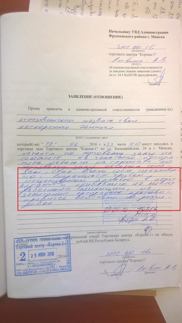 Я бы мог понять, если бы это заявление-отношение (которым потом и объясняли моё задержание) было заявлением должностного лица, мол ему, как начальнику, донесли информацию подчинённые, он написал заявление и сотрудник милиции пошёл меня задерживать. Но начальник управления оперативно-дежурной службы милиции (в ответе на жалобу из МВД) утверждает, что заявление написано физическим лицом, то есть выходит, что товарищ Логвин сидел у себя в каморке на втором этаже, каким-то образом понял, что кто-то безбожно матерится в торговом зале (в суде мы пришли к тому, что по камерам это определить невозможно). Дальше он решил проявить свою гражданскую позицию и написал заявление в милицию на какого-то матерящегося хулигана. Сидящий за соседним столом прапорщик (а он действительно там за соседним столом сидит) тут же принял заявление и отправился на поиски нарушителя. И, вы не поверите, но нашёл.