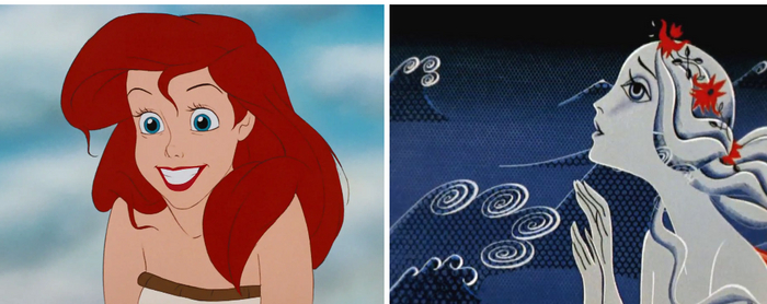 Русалочка. Диснеевская Ариэль (1989), а Союзмультфильмовская - безымянная (1968). Диснеевская выжила, а советская повторила судьбу книжного оригинала.