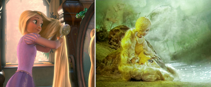 Рапунцель (Дисней, 2010) и дочь Великого Полоза по имени Золотой Волос (Союзмультфильм, 1979). Во втором случае молодой охотник смог заполучить и девушку, и всю 30-пудовую ее косу. Обе девушки в 3D-мультфильмах, кстати, несмотря на разницу в возрасте.