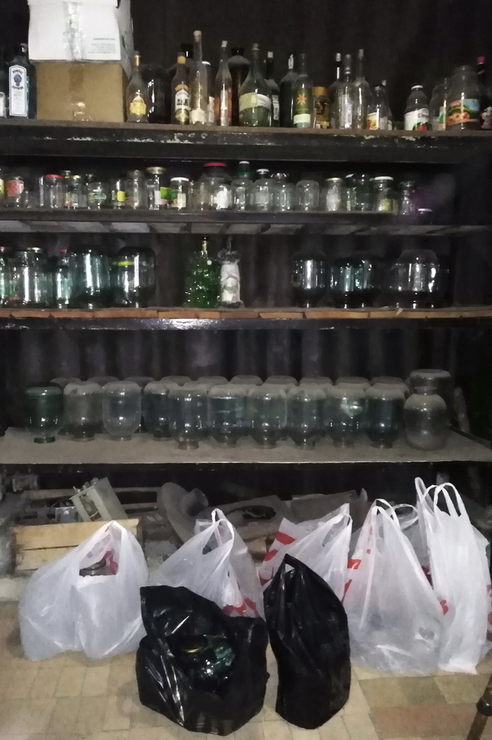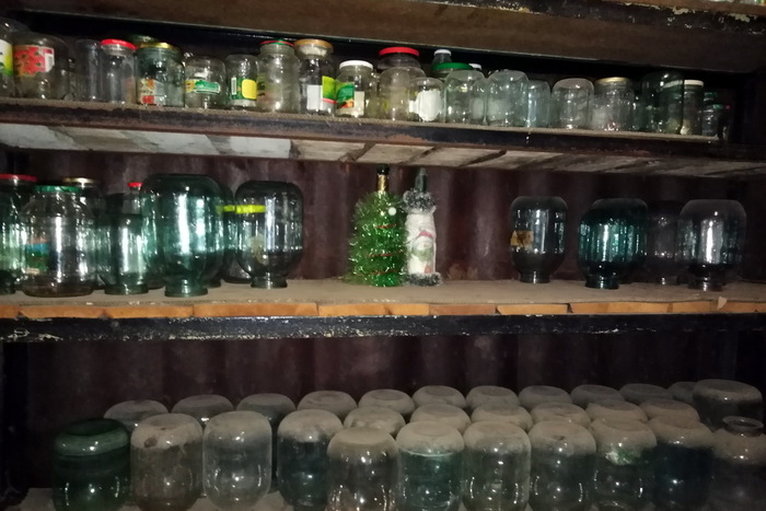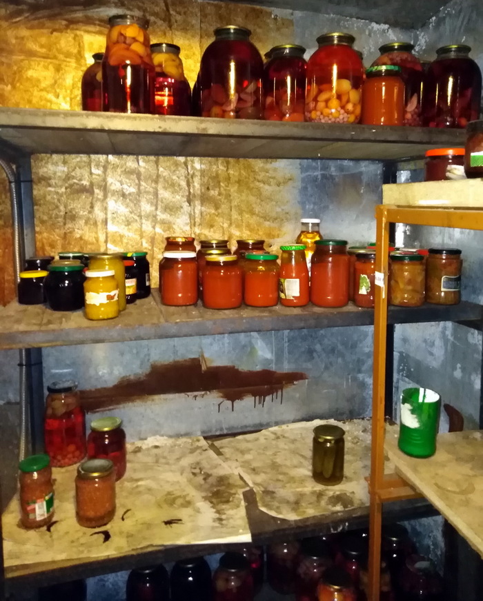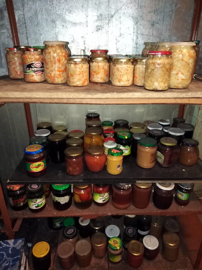Также, как и у всех садоводов и огородников есть у нас стратегический запас банок, которые летом и осенью постепенно заполняются и перемещаются из сарайки в дом, а затем в овощехранилище.