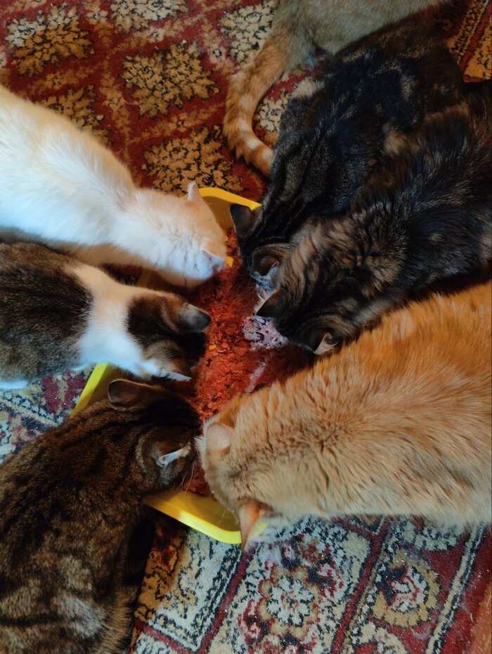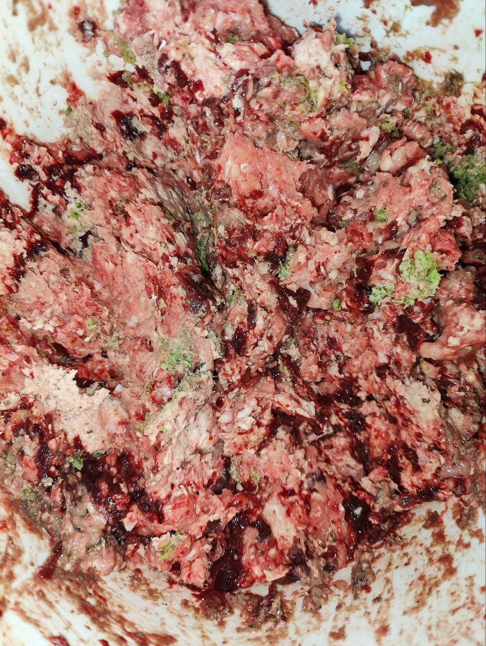 Вчера были ноги курицы, печень, говяжье легкое и говяжья обрезь. Зеленое - это немного кабачка. Как видите, некоторые не едят фарш, а едят корм. Те, кто едят фарш, не подходят к корму до утра (я не знаю, как это объяснить).