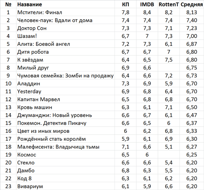 Таблица с рейтингами Кинопоиска, IMDB и Rottentomatoes.