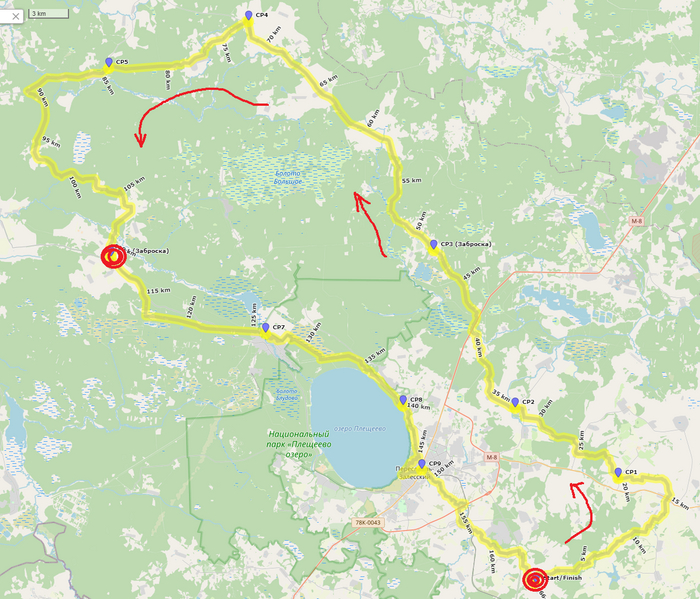 Вот карта гонки. Красный кружок внизу это старт-финиш, красный кружок слева выше это контрольный пункт, на котором Алексей принял мужественное решение.