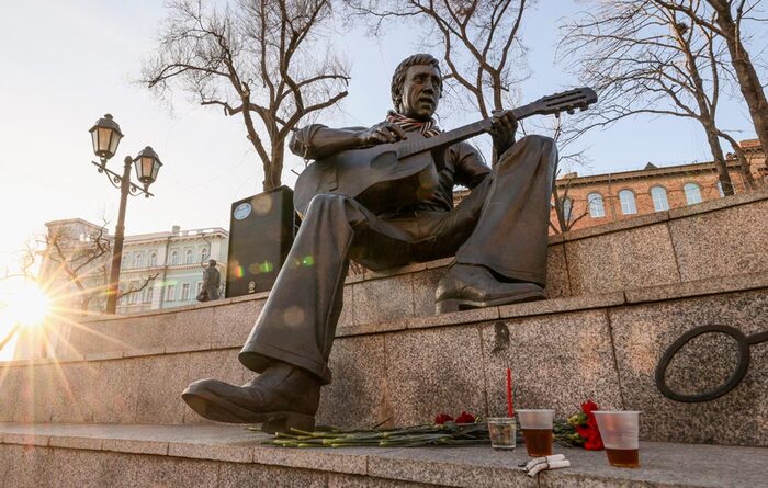 Памятник музыканту Владимиру Высоцкому во время творческого вечера, посвященного 85-летию со дня его рождения, в Театральном сквере Владивостока