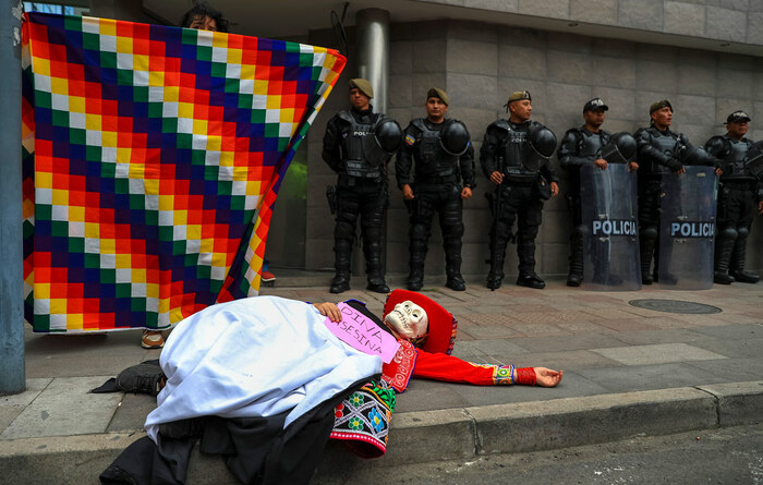 Организации коренных народов Эквадора протестуют перед посольством Перу в Кито в знак солидарности с перуанским народом