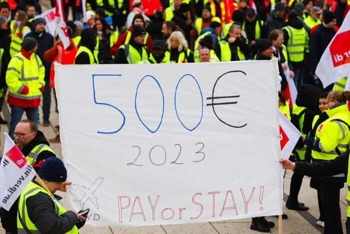 Забастовка работников аэропорта Берлина. Все рейсы отменены. Требуют +500 € к ЗП, им предлагают разовую премию 2000 € [надпись на фото: платите или не летите].