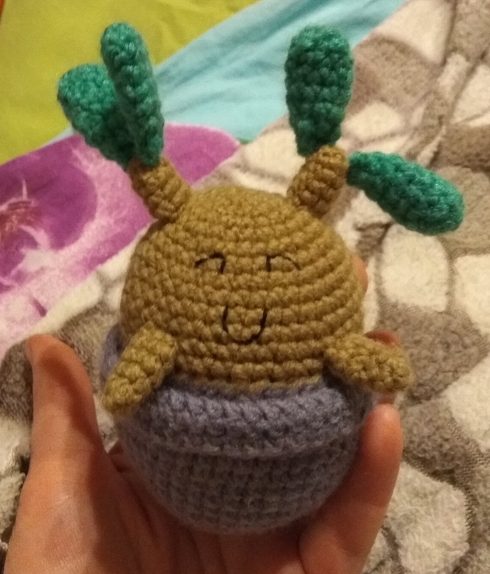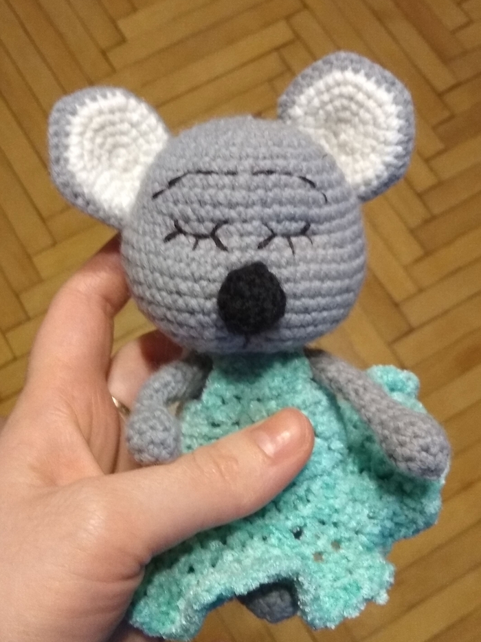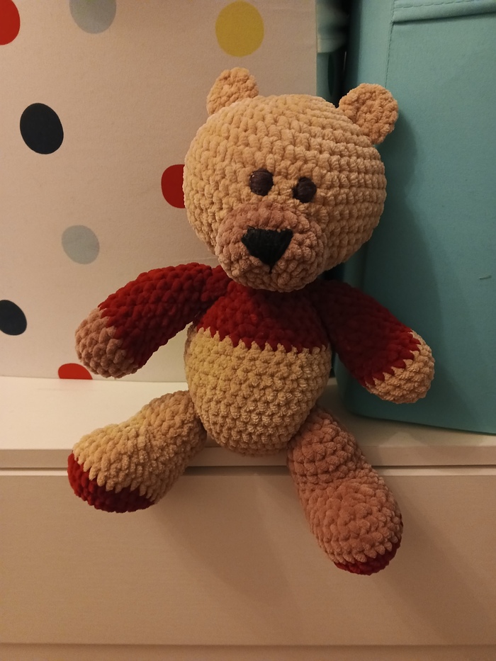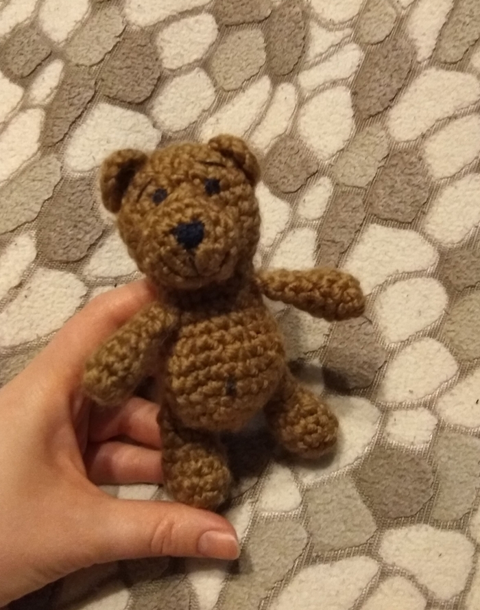 Вот например моя самая первая игрушка связанная крючком. Миниатюрный, набит ватой, пряжа неизвестного происхождения, вышивка обычными нитками для шитья.