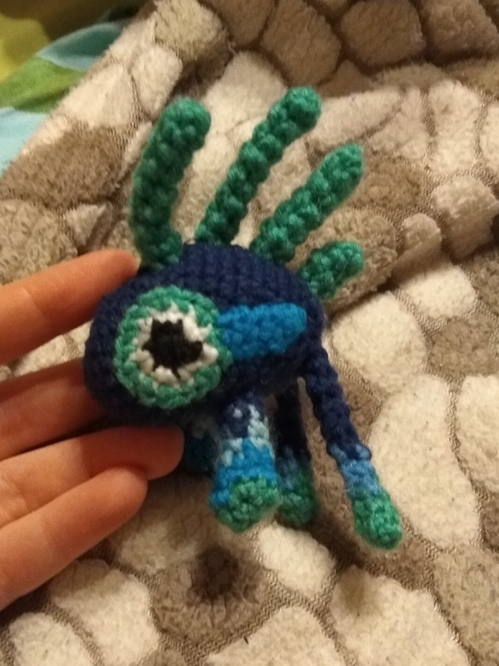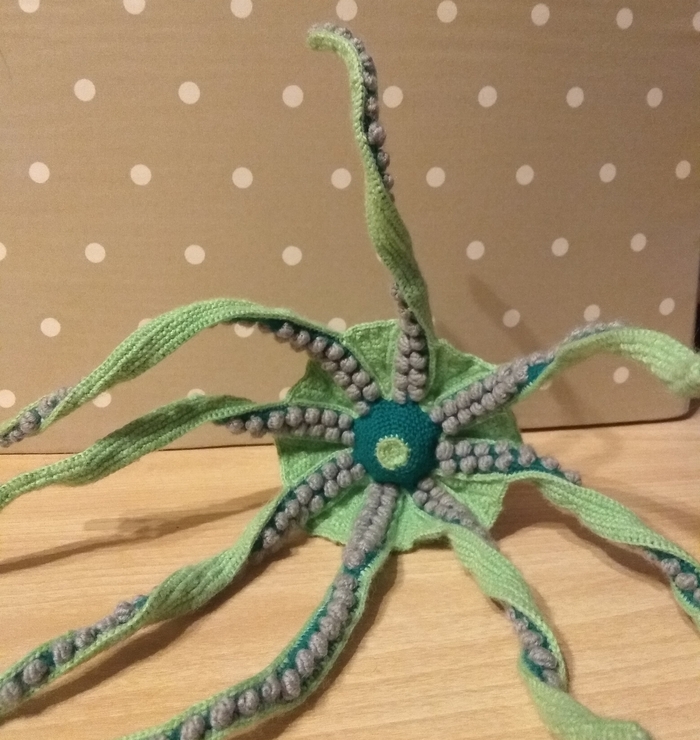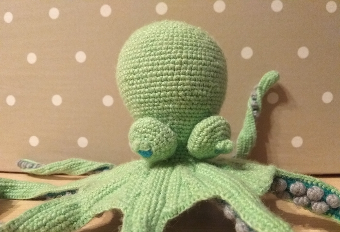А на примере осьминогов ощутила различие в толщине пряжи. Белый связан 3 крючком, а зеленый 1,5.