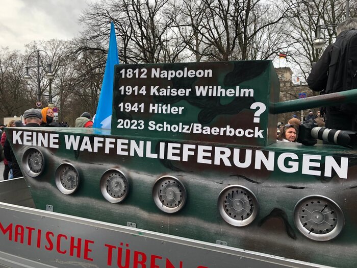 В 14 00 возле Бранденбургских ворот прошла демонстрация за прекращение поставок оружия и скорейшее начало мирных переговоров, созванная депутатом Бундестага Сарой Вагенкнехт из партии левых.