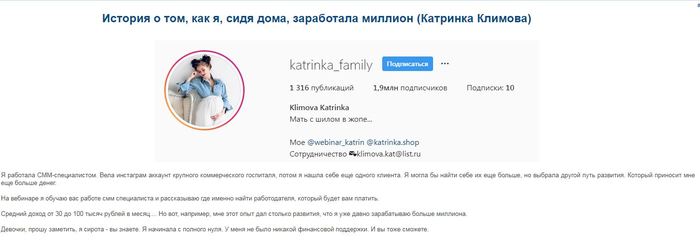 Итак, первый курс, который я решил взять называется так, чтобы цеплять любителей халявы и легкого заработка - “История о том, как я, сидя дома, заработала миллион” - автор Катринка Климова. Что хочется сказать - название интригующее, но по факту это очередной курс подготовки СММ специалистов.