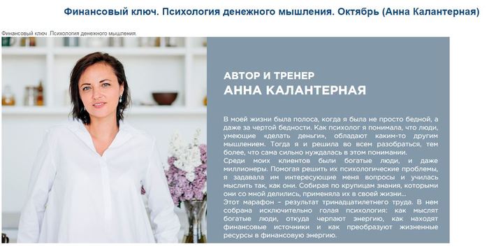Подходим к тому самому курсу, который призван изменить наше с вами мышление и резко открыть наше сознание в сторону зарабатывание и комфортного получения денег. Называется он “Финансовый ключ. Психология денежного мышления”, автор - Анна Калантерная.