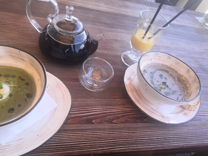 Большую часть времени мы питались в кафе-столовой в метрах 200 от нашего отеля - Окрошкин. (На территории отеля есть несколько столовых, но мы в них так и не поели - в одной были блюда из Окрошкин, в другой было всегда занято и блюда по большей части типа перекусов- сырники, блинчики, сандвичи, бургеры). У меня не было цели как-то ее пиарить или рекламировать, поэтому я не фоткала наши обеды. В обед брали мы приблизительно: Борщ, окрошку, овощной салат (типа греческий или обычный)/оливье/крабовый, отбивная/котлета/мясо по-французски/жаренная скумбрия и что-то к чаю - средний чек на 2х выходил 700-1000руб. Перерыв все, нашла у себя фото завтрака, его и добавлю. На 2х такой завтрак выходил в пределах 400-500руб