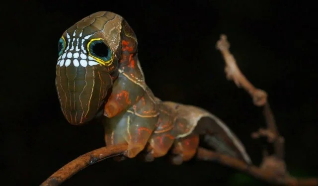 Сложно сразу распознать, но перед вами австралийская гусеница. Мы уже наслышаны, что Австралия - это самый уникальный континент, а эта гусеница - еще одно тому подтверждение. "Боевая" раскраска, напоминающая черные глаза с голубой радужной оболочкой и белые зубы, призвана отпугивать любых недоброжелателей. Этот вид гусениц питается только одним видом растений и находится под угрозой исчезновения из-за резкого сокращения естественной среды обитания.