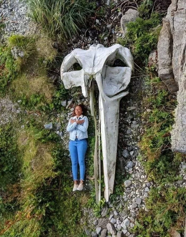Человек лежит рядом с черепом, который принадлежал синему киту. Синий кит длиной до 29,9 метров является самым крупным из известных позвоночных, когда-либо существовавших на Земле. Взрослый синий кит может съесть до 40 миллионов крилей в день, что составляет примерно 3600 килограммов или 1,5 миллиона килокалорий (это 3,5 коровы или 6200 батончиков "Сникерса").