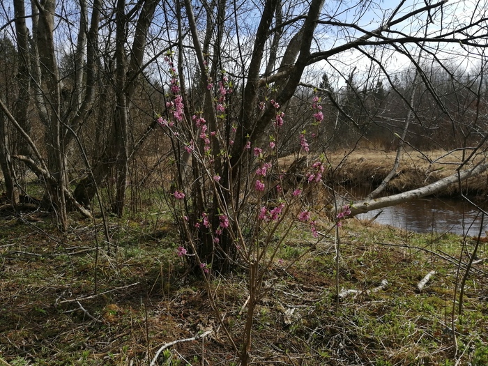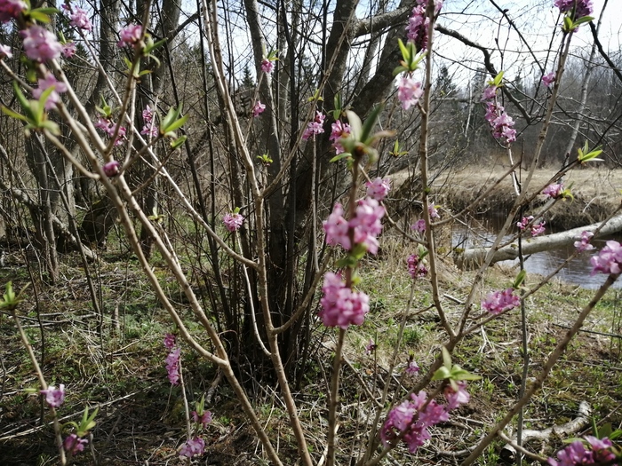 Волчье лыко, поразительно красиво цветёт на фоне серых берегов.