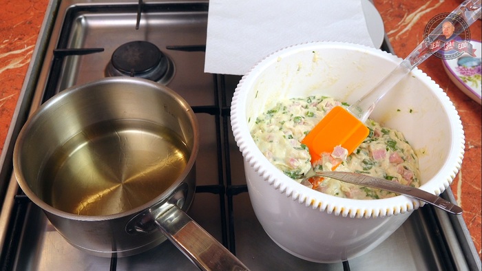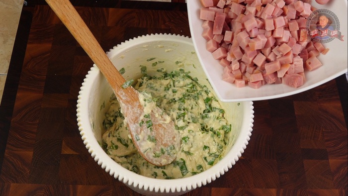 В тесто добавляю ветчину и зелёный лук. Смешиваю до однородной массы.