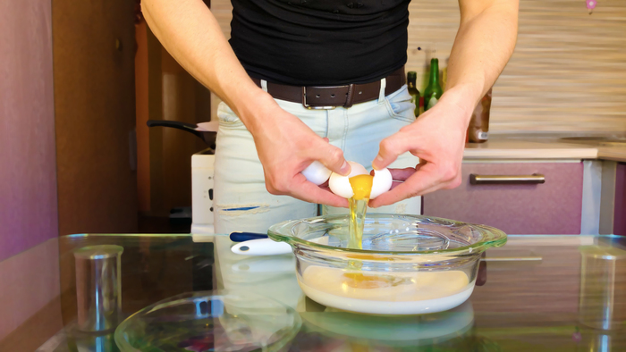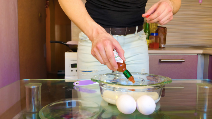 Шаг 2: Спустя ночь я готов продолжить готовить. Собираем панировочную станцию, которая состоит из жидкой и сухой смеси. Для этого в одной миске смешиваем стакан цельного молока и несколько капель острого соуса Табаско. У нас получится что-то вроде пахты, в которую мы еще добавим 2 крупных яйца. Взбиваем смесь пока не останется полосок от яиц.