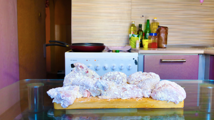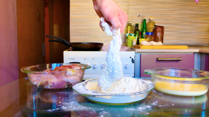Шаг 3: Теперь курицу обсыпаем сухой смесью, затем в яичную смесь, а затем обратно в сухую. Курице необходимо немного полежать в муке перед жаркой. В это время готовим масло для жарки. Нагреваем много растительного масла, так чтобы оно хотя бы на половину покрывало курицы.