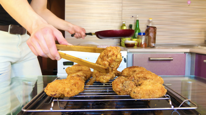Шаг 4: В нагретое масло аккуратно выкладываем курицу, чтобы не разбрызгивать масло и обжариваем курицу 5-7 минут с каждой стороны до золотисто-коричневой корочки, после чего перемещаем их на решетку установленную на противне. За это время не все куски успеют приготовиться, особенно это касается грудки. Единственное в чем я уверен, крылышки готовы. Поэтому остальные куски перемешаем в разогретую духовку при 180 градусов пока они полностью не приготовятся. Голень я допекал минут 10, а вот грудки все 20.