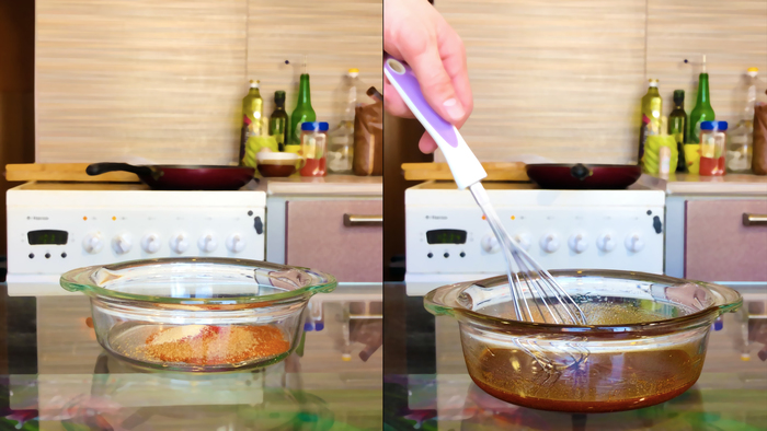 Шаг 5: Пока курица доходит до готовности, у нас есть достаточно времени, чтобы приготовить смесь из специй. Для этого в небольшой миске соединяем 3 ст.л. кайенского перца, 1 ст.л. коричневого сахара, по пол ч.л. паприки, чесночного порошка, соли и 1 ч.л. черного перца. Берем венчик и добавляем около половины стакана горячего масла для жарки. Перемешиваем. Мы все это должны делать в жаропрочной посуде.