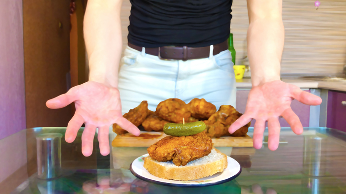 Теперь все что нам остается, это съесть эту привлекательную нешвилл горячую курицу. Но ее не едят просто так. Курица подается на кусочке хлеба с дольками соленого огурца, которые крепятся на кусочке курицы зубочисткой. Хлеб лучше поджарить, так он не успеет быстро промокнуть под натиском курицы.