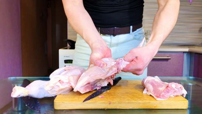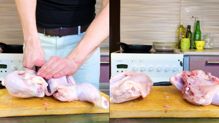 Шаг 1: Для начала промываем и просушиваем курицу. Дальше разделываем курицу на 10 частей. Начинаем с вырезания позвоночника. Потом разрезаем курицу по грудке пополам.