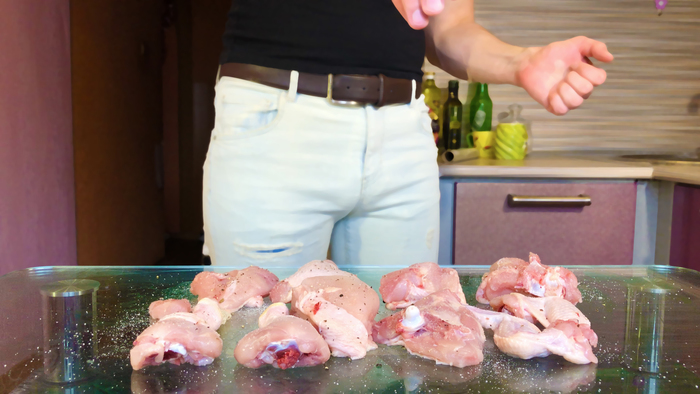 Дальше курицу разделываем по суставам. Вокруг сустава делаем надрезы, чтобы его оголить. После чего спокойно по этому суставу ножом отделяем части курицы. По путно отрезаем лишние и обвисшие куски кожи. Крылышки я оставлю целыми, разве что можно отрезать нижние фаланги. А вот грудки я разрежу пополам, чтоб получилось ровно 10 кусков. В результате получилось по два бедра, две голени, два крылышка и 4 куска грудки. Дальше куски курицы еще раз просушиваем, посыпаем солью и перцем со всех сторон, после чего убираем в безопасный для пищевых продуктов контейнер и плотно закрываем пленкой. Теперь курицу убираем в холодильник на 4 часа, а лучше на ночь.