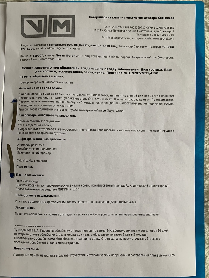 История такая: заводчики американских булли. Порода в России редкая. Дорогая. У суки многоплодная беременность. Щенки раструт, все здоровые, но спустя 2 недели у одного щенка начинаются судороги, проблемы с глазками, зрением, с лапками и необычными припадками. Заводчики обращаются к врачу не сразу, как обычно все ждут, что пройдёт само. В Клинике говорят, что нужно посетить терапевта, невролога, ортопеда, офтальмолога, сдать кучу необходимых анализов и сделать дорогие исследования типа КТ и МРТ.