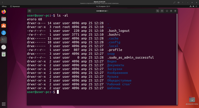 Более того, вы можете совмещать использования ключей, что позволит вам более гибко работать с командами. В нашем же случае, можно совместить уже знакомые ключи -l и -a. Что позволит увидеть файлы и каталоги более подробно: