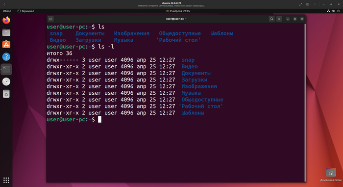 Это содержание вашего домашнего каталога. Что бы вывести более подробную информацию из каталога, можно воспользоваться ключом -s. Эта команда выведет не только содержимое каталога, но так же отобразит права доступа, размер каталогов и их дату создания: