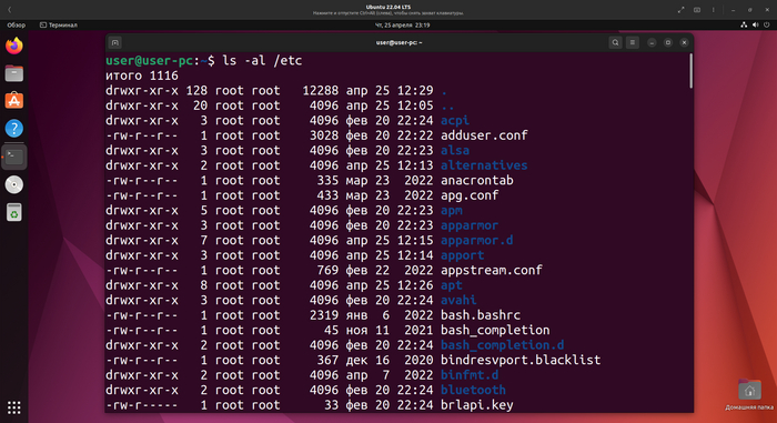 Конечно, можно смотреть командой ls содержимое и других каталогов. Для этого достаточно указать путь к каталогу, который вы хотите просмотреть. К примеру, давайте выведем содержимое каталога /etc. И применим уже известные нам ключи, которые расширяют возможности команды ls: