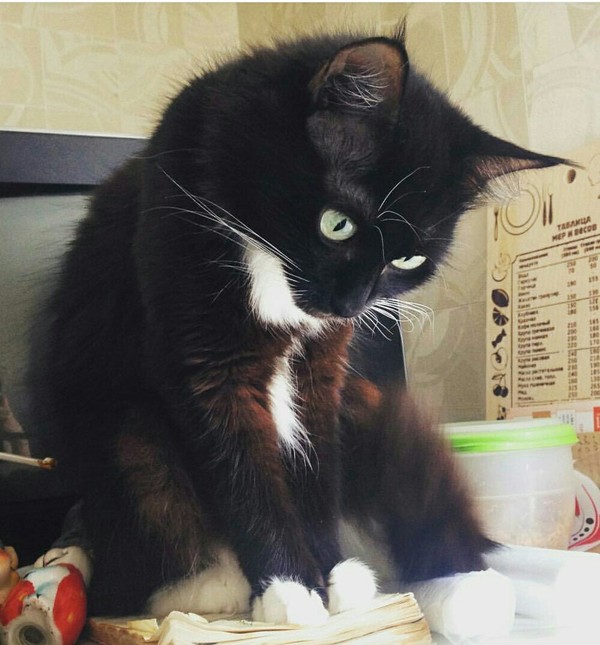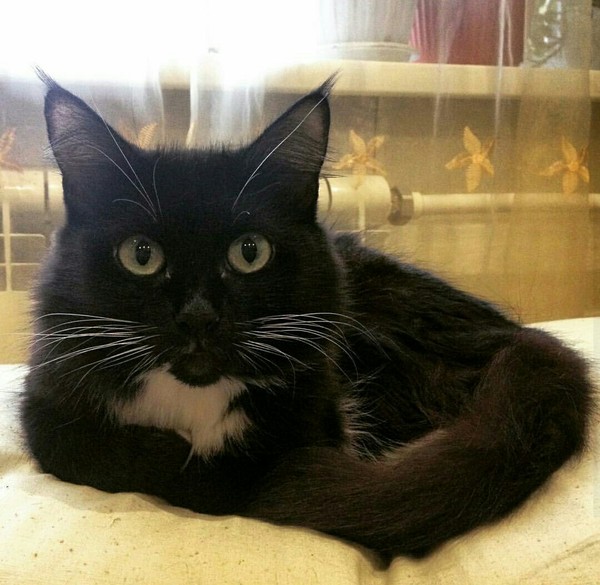 Она не сильно большая, пушистая, почти вся черненькая, лапки и грудка белые, усы и бровки длинные и белые, хвост длинный и пушистый, глаза желто-зеленые.
