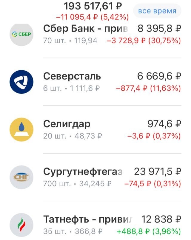 Татнефть прив. – 12,8 к, Сургутнефтегаз – 23,9 к, Лукойл – 4,2к, Газпром – 15,8к, Газпром нефть – 20,7 к. Всего 77,4 к. 40 процентов от портфеля. Все неплохо, но я бы изменил процентное соотношение больше в пользу Газпрома и Лукойла. Думаю, что Газпром должен заплатить дивиденды, да и Лукойл тоже со временем начнет это делать. $GAZP $LKOH