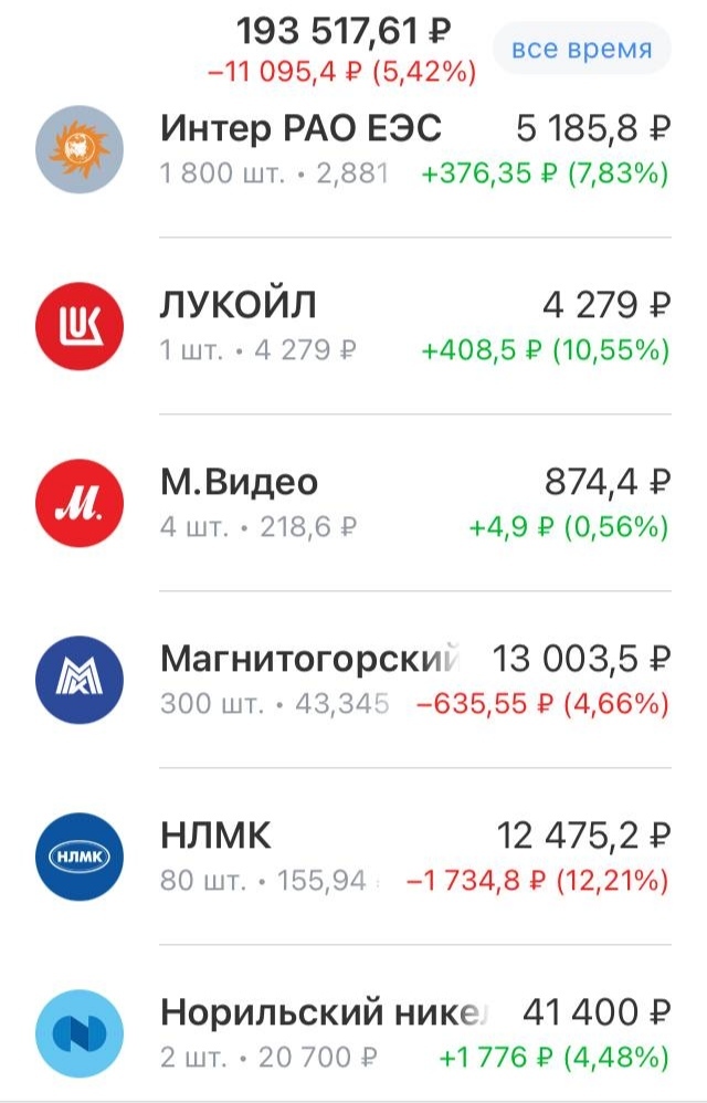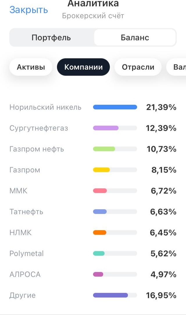 73,4 к или 38 процентов от портфеля. Много, в индексе Мосбиржи металлурги занимают всего 11 процентов. Продавать не стоит, лучше докупать компании в других секторах. Большая доля Норильского никеля – это плюс, черные металлурги отменяют дивиденды. НН продолжает платить, да и в целом выглядит перспективнее. $GMKN
