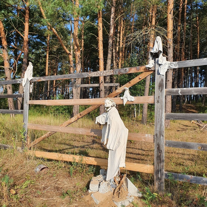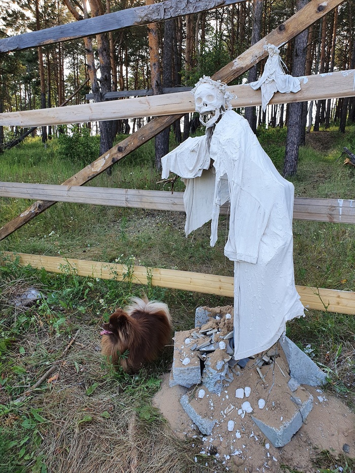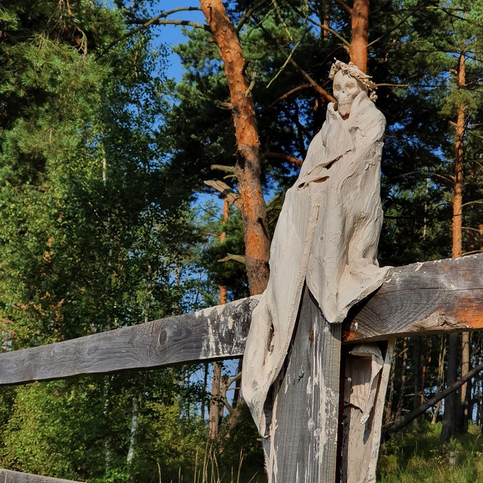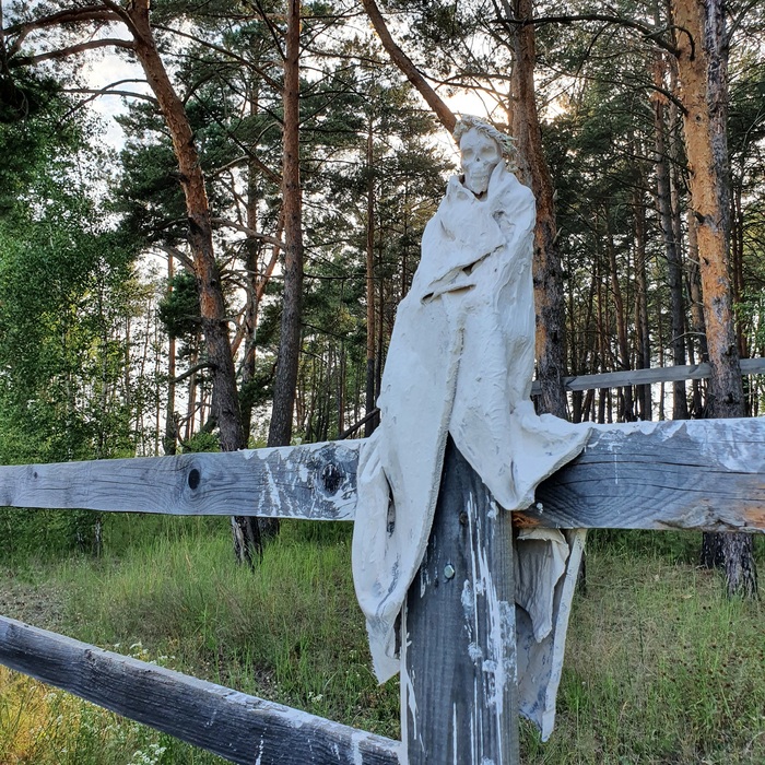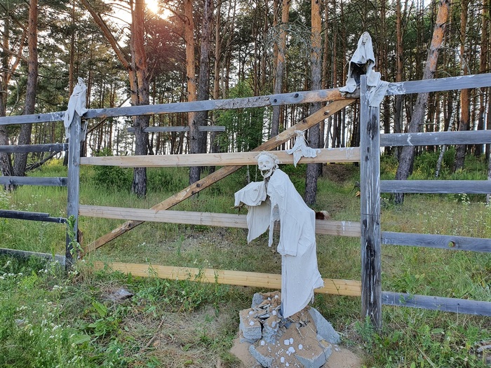 Композиция началась с "гнома" в человеческий рост: на черенок от лопаты проволокой примотала сосновую палку, сверху нахлобучила гипсовый череп и потом пропитанную в гипсовом растворе ткань накинула на "плечи". Все.