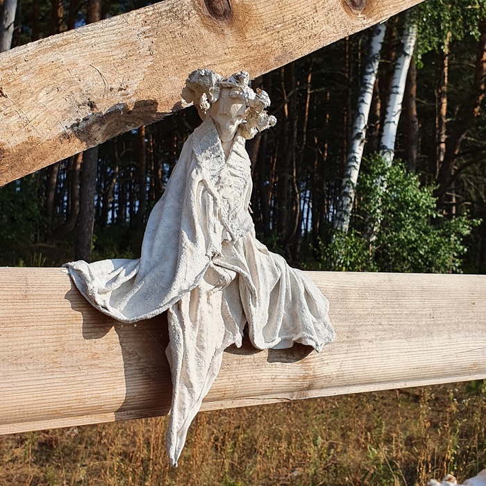 Получился небольшого размера милый грустный персонаж. Если вы обратите внимание, у него на голове веночек. Это настоящий венок из полевых цветов, пропитанный в гипсовом растворе.