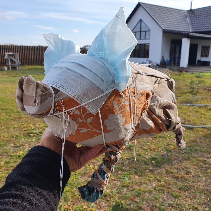 Ну и свинью тоже сниму. Фото процесса сохранились, а готовой в гипсе не нашла, чтобы сразу все показать. Она тоже сделана из 5-литровой банки, проволоки, масок и ткани, после чего залита гипсом. А это прошлогоднее фото процесса