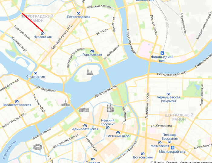 Ул. Большая Зеленина на отрезке от м. Чкаловская до Большого Крестовского моста.