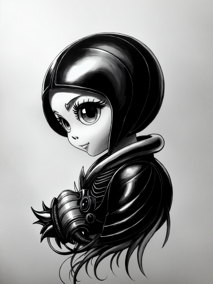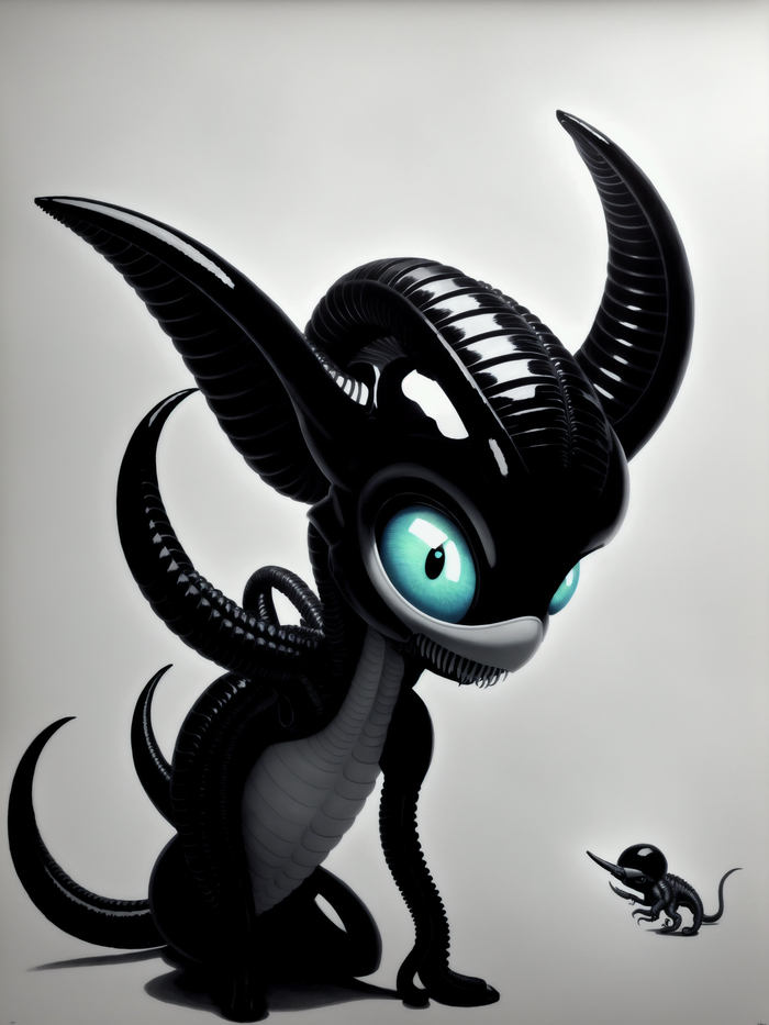 the famous beautiful picture portrait sweet cute beautiful pixar xenomorph is drawn with a soft pencil with small strokes on a landscape, simple lines