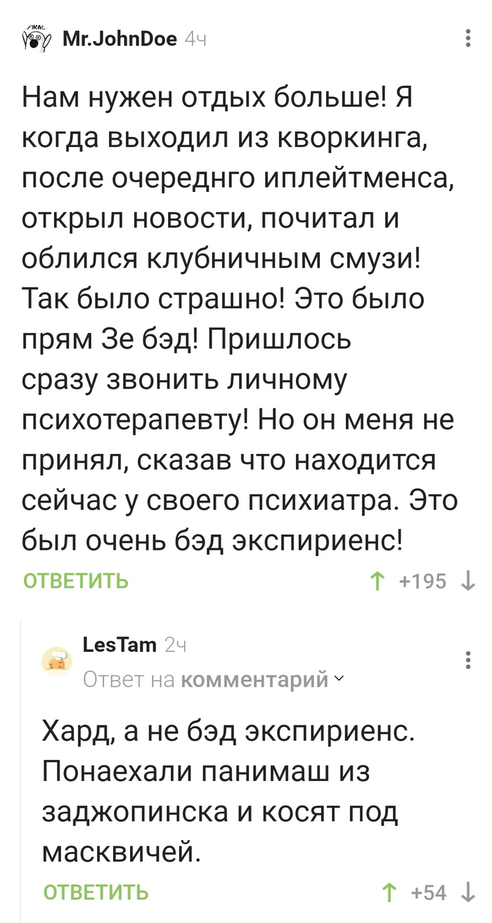 На сегодня работа практически стоит, я должен примерно на 2,5миллиона больше чем мне (от банкнота не жду). Не катастрофа, но что-то я так задолбался в эти полтора года... Надо дела делать, а делать ничего нет хочется. Вчера новости смотрел, вообще накрыло.
