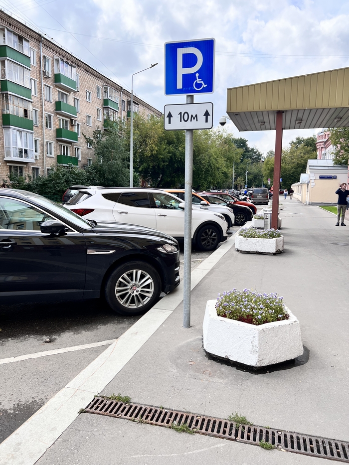 Я сегодня отмерил - согласно знаку, инвалидная парковка - следующие 10 метров. Рулетки конечно не было, но место, на которое встал, еще в этом диапазоне, хоть разметки и нет