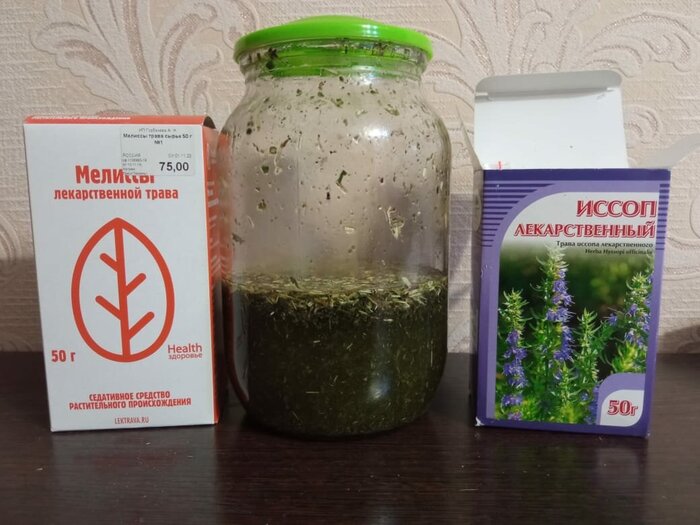 С полученного дистиллята отделяем примерно 250-300 мл. добавляем в него 15 гр. травы Иссопа и 10 гр. Мелиссы. Убираем это все на 3-4 дня в темное место.