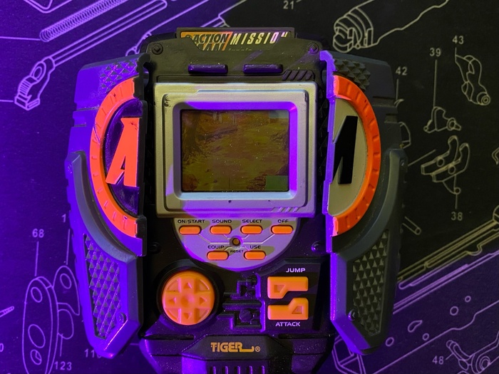 Была как-то в 2000 или 2001 году подарена мне на новый год. С тех пор сколько не пытался найти инфу про неё, ни разу ничего не попадалось. Искал на Гугле, Яндексе, Авито, Ebay, всё в пустую, даже поиск по картинке не мог выдать то, что мне надо. Имеется игра Action Man Mission от Tiger Electronics и Hasbro. Указан 2000 год, все права защищены, сделано в Китае и параметры питания (тип и кол-во батареек и напряжение). Больше ничего нет. Игра работает, все картриджи на месте. Не видел в поиске других игр от Tiger, в которых есть картриджи и какой-то звук, сложнее пищалки, как в Нокии 3310, а здесь сложнее.