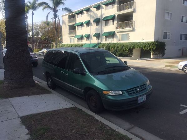 Через минуту из соседнего дома выходит парнишка лет двадцати, и его родители. Парень спокойно говорит по английски и в отличии от телефонного разговора, в жизни я понимаю все, что он говорит. А вот родители его говорят только по испански. На мой вопрос, который я уже задавал с некой неуверенностью в голосе, а где Mitsubishi Eclips? Мне ответили - "Eclipse? Мы продаем Plymuth Grand Voyager!" И в этот момент парнишка показывает рукой на стоящий рядом, весь в листве, с полуспущеными колесам огромный, зеленый, с полу облезшей краской минивэн! Я смотрю на Юру, Юра на меня, Мексиканская семья на нас. И тут Юра говорит: "Он хотя б заводится?". Нам отвечают что да! И поискав ключи, нам открывают это чудо. Оказалось, что он реально заводится, хоть и стоял, как нам сказали, около месяца на приколе, хотя внешне казалось, что он стоит полгода. Внутри машина оказалась очень чистой и ухоженной. Единственное что было не так - это провисающий потолок, но с ним можно жить! Мы решаем проехаться. Машину очень ведет вправо. Но у нас почти все колеса спущены. Доехав до заправки, владелец заправляет машину на двадцать пять долларов, и оплачивает подкачку всех колес, при этом всем, у меня лично было ощущение, что я приехал к Мексиканскому Дяде Ваньо в деревню и покупаю у него Ниву. Накачав колеса, увод вправо немного остался, но это выглядело не критично. Не налево - на встречку, уже хорошо. При этом Дядя Ваньо - Отец семейства, честно сказал, что скорее всего увод из-за лысой резины. Но поменять резину - не дорого, поэтому приехав обратно мы поняли, что это то, что мы искали! Минивэн, на ходу, с магнитофоном и ауксом, стрёмный, но харизматичный. Цену на сказали тысяча пятьсот долларов. Мы сходу попросили тысяча триста, так как надо покупать резину. Продавец подумав полсекунды согласился, что нас немного смутило, но я думаю он так согласилься только потому, что никто в жизни не купил бы эту машину, кроме нас, а на безрыбье и рак рыба!