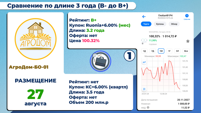 27 августа стартует размещение облигаций от ООО «АгроДом» (БО-01). У эмитента на данный момент нет рейтинга, но, судя по премии к ключевой ставке, это точно диапазон В- до В+. Посмотрев схожие параметры и длину, нашлось всего три аналогичных выпуска.