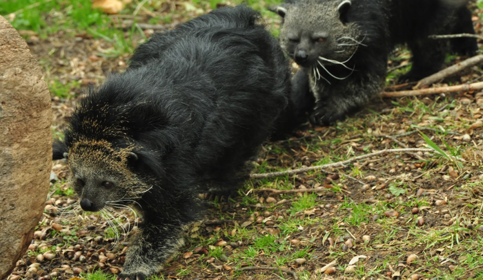 А еще у бинтуронгов очень милый секс. Когда самец залезает на самочку, то она берет свой хвост и эротично прижимает самца ближе к себе. С любовью. Кстати, бинтуронги относительно моногамны. После вынашивания 2-3 детей, мать разрешает самцу быть рядом и помогать в заботе, хотя эмоционально все равно доминирует именно она, поэтому мужик бинтуронга каблук и считается, что у этого вида матриархат.