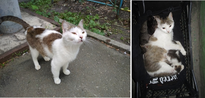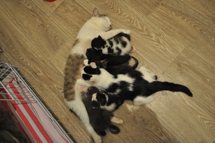 Но случился самый настоящий облом, кошка решила, что с нее хватит радостей материнства и ни в какую малышню принимать не стала вот тебе и Маркиза... Поэтому в срочном порядке был найден единственный подходящий вариант: подъездная мать-героиня Люська (местное имя), которая выкормила 5 своих и 4 приемных котеек. Малышню раздали, Люсю стерилизовали и оставили обживать подъезд дальше. Люсю привезли на выкармливание, если нет, то вернут обратно в родной дом подъезд.