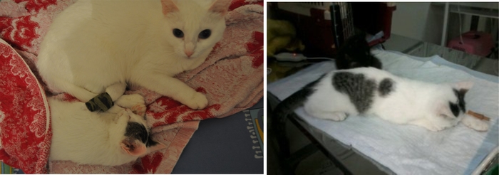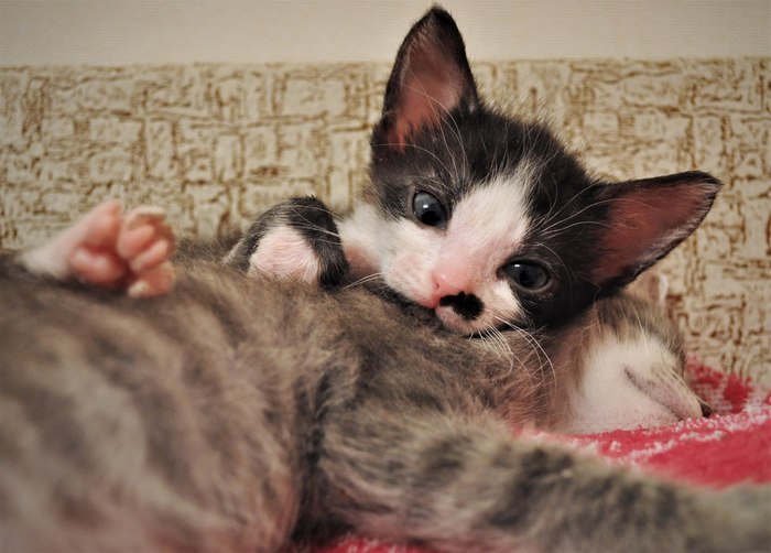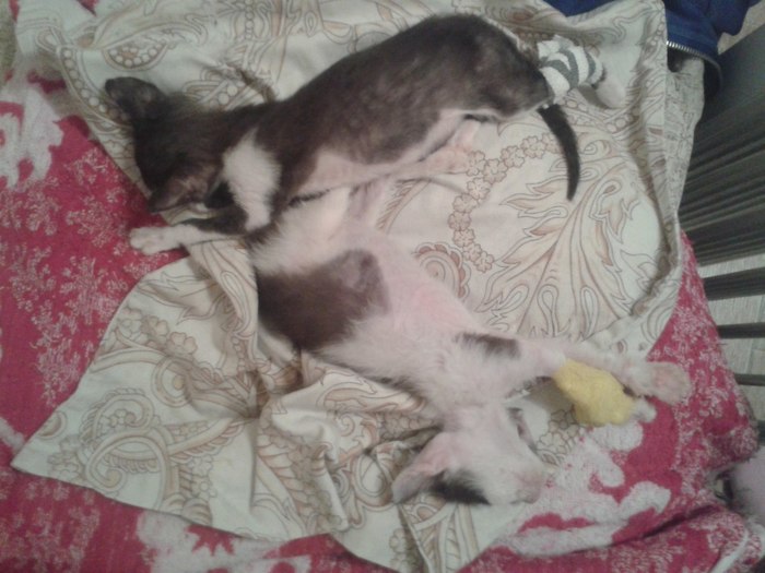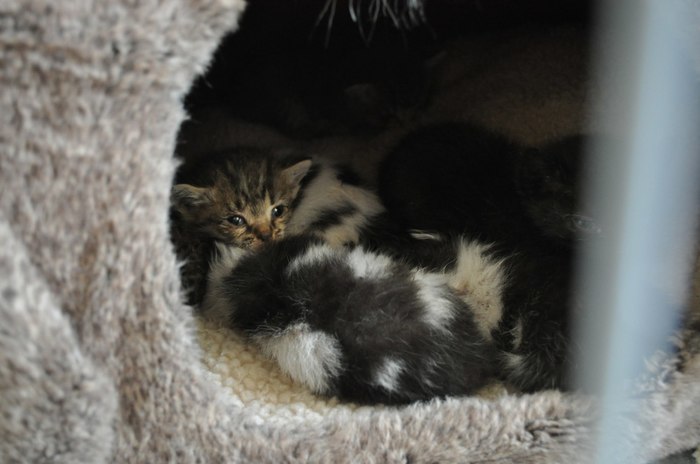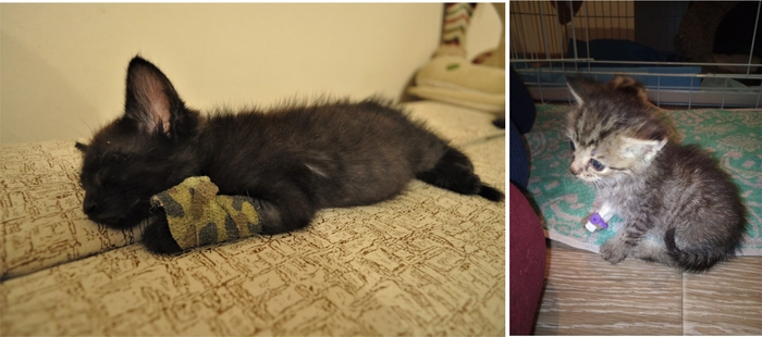 И 6 слепых котят из двух разных пометов: Пупырку, Пельмешка, Аду, Тень, Личи и Нойну. История котят такая: к ветеринарной клинике подбросили котят в коробке, после чего котята перекочевали в мусорный бак. Оттуда их достал местный бездомный мужчина, пытался кормить молоком, грел. Но не смотря на его доброе сердце, в его условиях выходить котят без мамы было не реальным, поэтому котят принесли ко мне на выкармливание кошки. Малыши были изъедены блохами, тазик с кровавой водой до сих пор стоит перед глазами.