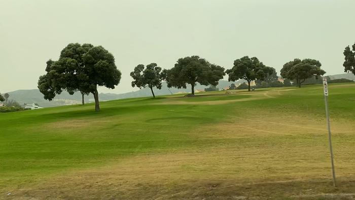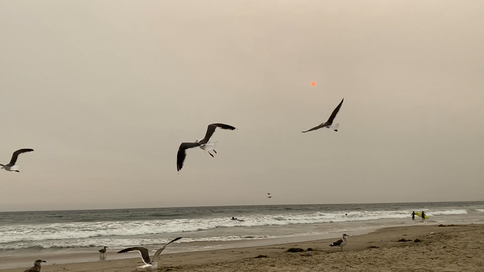 Сегодня ситуация намного лучше. Дым рассеялся и выглянуло солнце. А неделю назад пляж выглядел вот так.